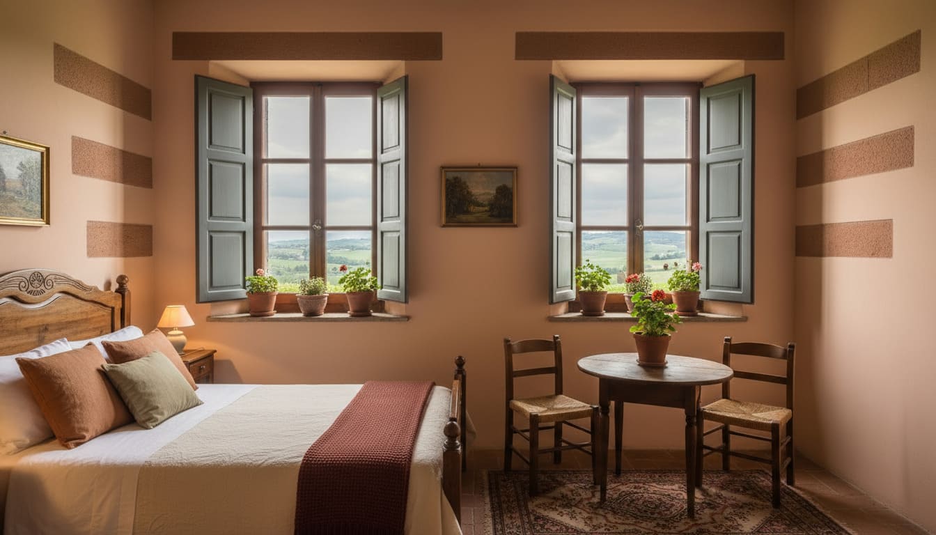 “Un ambiente solare e accogliente, caratterizzato da colori caldi che richiamano i campi di girasoli che circondano l’agriturismo durante l’estate. L’arredamento rustico si fonde con dettagli eleganti per offrire un’atmosfera rilassante e familiare. La luce naturale che filtra dalle finestre illumina ogni angolo della stanza, creando un rifugio sereno dove rigenerarsi dopo una giornata trascorsa tra natura e tradizione.”