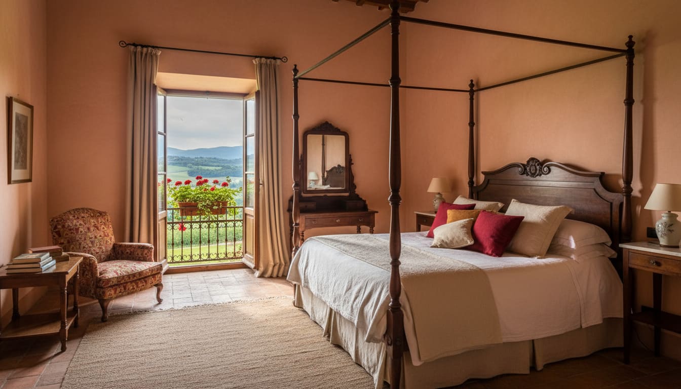 “Un ambiente luminoso e raffinato, arricchito da arredi d’epoca e da un elegante letto a baldacchino che richiama lo stile autentico delle case di campagna toscane. La grande finestra con balconcino regala una vista indimenticabile sui campi e le colline, offrendo al tempo stesso pace e romanticismo.